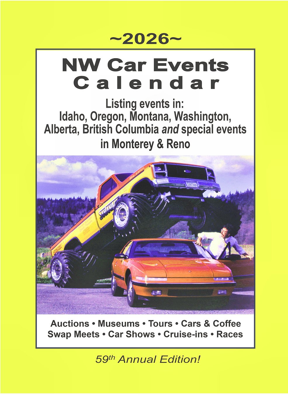 Yellow Books can also be purchased directly from our vendors — Cliff’s Classic Chevy Parts, The Bird Nest, Vintage Motor Books, It’s A Classic, Grafitti Alley, WAAAM, Le May Collections At Mary Mount, and Drager’s Clubhouse at the normal retail price of $6. NW Car Events Calendar will also have books at the All Motorsports Swap Meet (Pacific Raceways, Kent, WA), Early Bird Swap Meet (Washington State Fairgrounds, Puyallup,WA) and the Portland Swap Meet, (Expo Center, Portland, OR) PIR Auto Swap Meet (Portland, OR) and the Monroe Swap Meet (Monroe, WA).